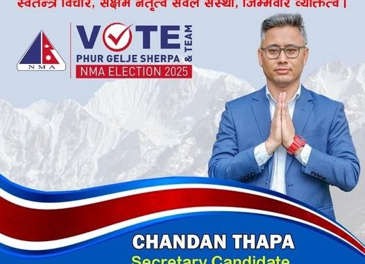 काठमाडौं – नेपाल पर्वतारोहण संघ (NMA)को २०८२ साल भदौं ७ गते (२०२५ अगस्ट २३) हुने निर्वाचन नजिकिँदै गर्दा पर्यटन क्षेत्रमा सक्रिय व्यवसायी चन्दन थापाले...