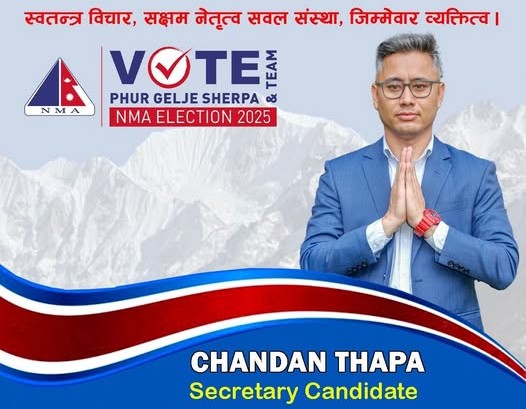 काठमाडौं – नेपाल पर्वतारोहण संघ (NMA)को २०८२ साल भदौं ७ गते (२०२५ अगस्ट २३) हुने निर्वाचन नजिकिँदै गर्दा पर्यटन क्षेत्रमा सक्रिय व्यवसायी चन्दन थापाले सचिव पदका लागि औपचारिक उम्मेदवारी घोषणा गरेका छन्।